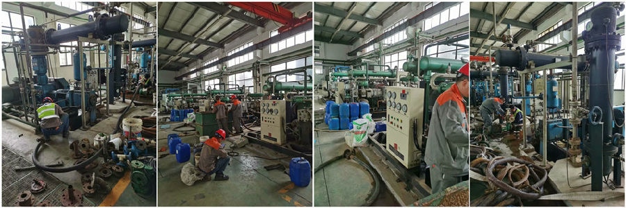 因垢厚重及其成份较为复杂,即有碳酸盐垢,又有碳酸盐垢与其它垢质相结合的混合垢质,致使大香蕉导航网址药剂与污垢反应缓慢,给大香蕉导航网址造成了一定的困难。在我司丰富的大香蕉导航网址经验和技术员研发配制的冷却器大香蕉导航网址剂相结合下,彻底清除了所有顽固污垢,还原金属表面本色,且腐蚀率低,大幅提高了换热效果,顺利结束了此次空压机冷却器大香蕉导航网址项目。
